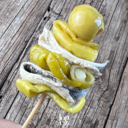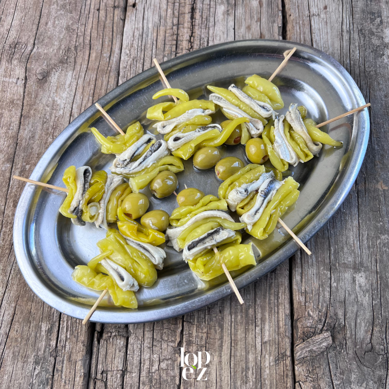 Ingredientes: Piparra (guindilla, agua, sal, ácido acético y E223). Aceitunas rellenas de pimiento (Aceitunas, agua, pasta de pimiento [pimiento, gelificantes: alginato sódico (E-401) y goma guar (E-412), endurecedor: cloruro cálcico (E-509), sal corrector de acidez: ácido láctico (E-270)], aceite de girasol. BOQUERÓN (Filetes de Boquerones (PESCADO), vinagre, agua y sal).